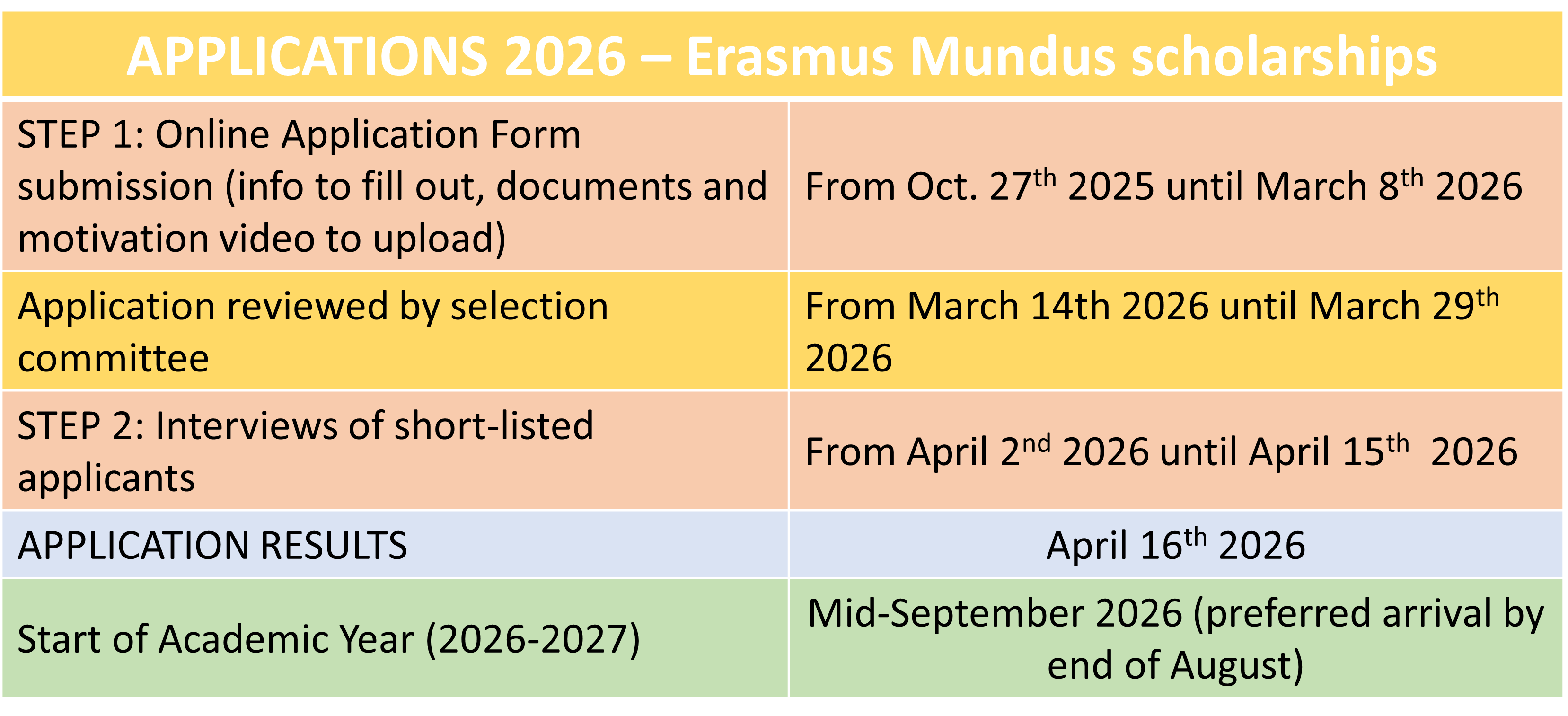 Applications to the Erasmus Mundus scholarships will open from Oct. 27th 2025 until March 8th 2026.